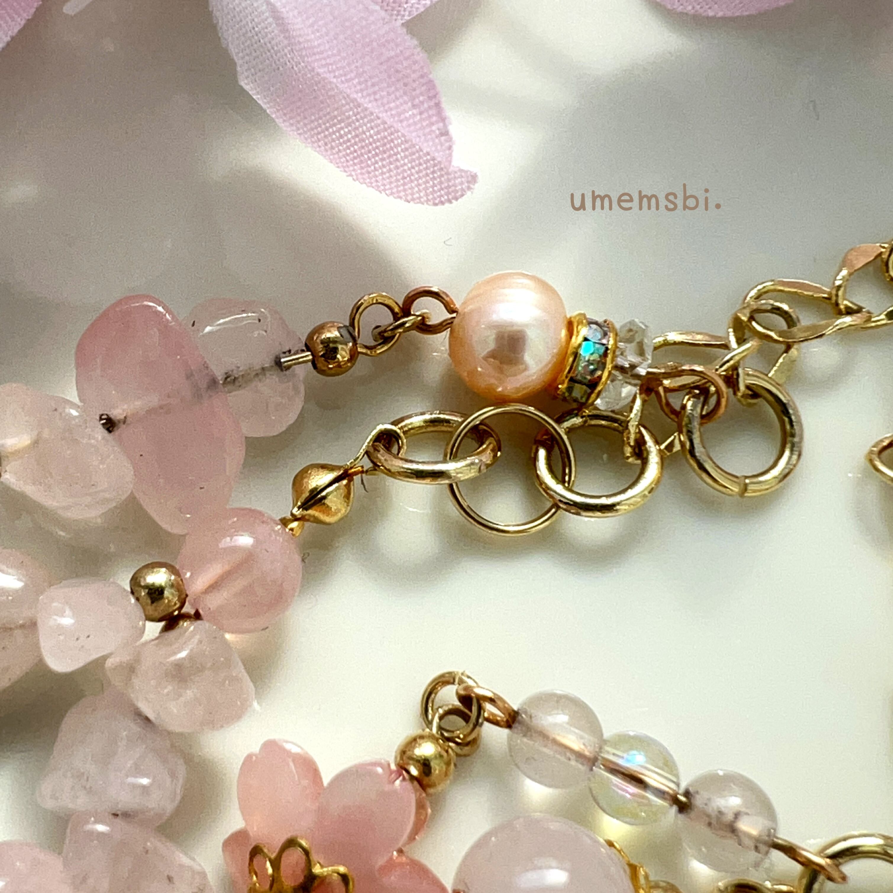 淡い桜色のグラデーションが施されたローズクォーツは、ラウンドとさざれ石で立体感を持たせ、桜の花の儚さと優雅さを表現しています。