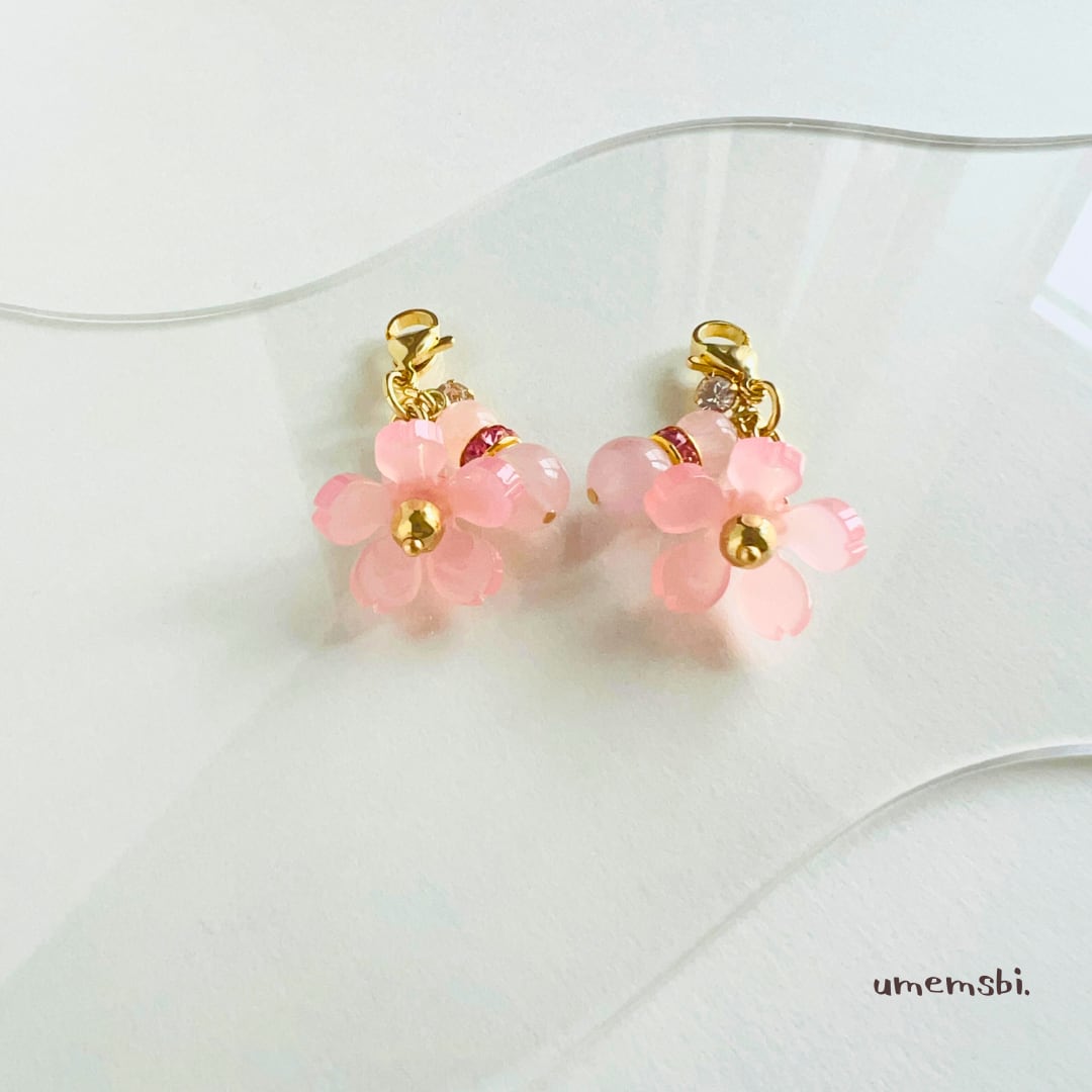 可憐な桜モチーフに、ゴールドとピンクのロンデルを添え、クリアビジューがさりげなくきらめくデザイン。