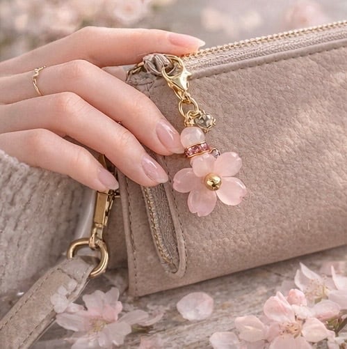 ローズクォーツ(6ミリ・8ミリ)を使用し、桜の花を主役に仕立てた、和の趣ただよう上品な天然石チャーム。