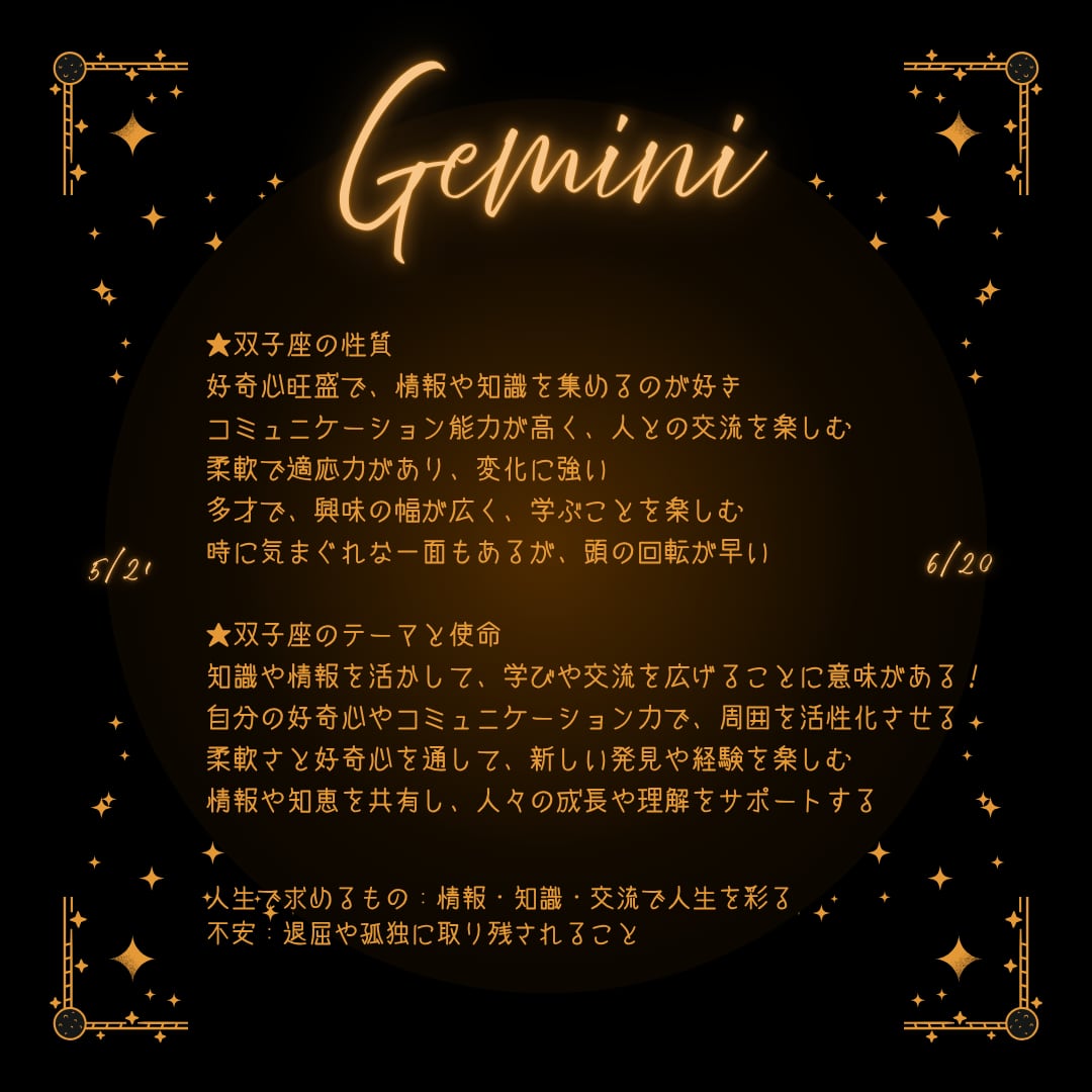 双子座は12星座の3番目の星座で、知性や情報、交流を大切にしながら、自由に世界を広げていくタイプ。