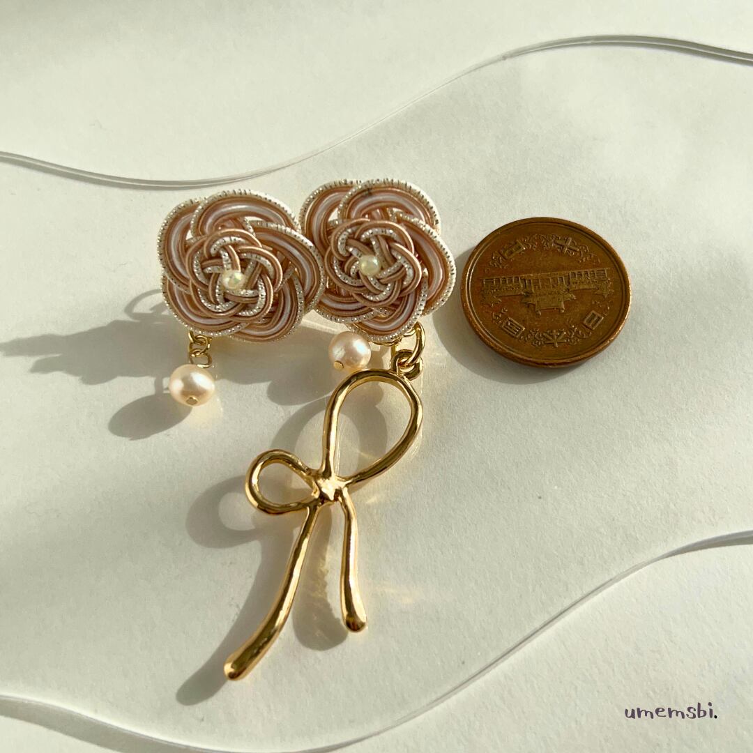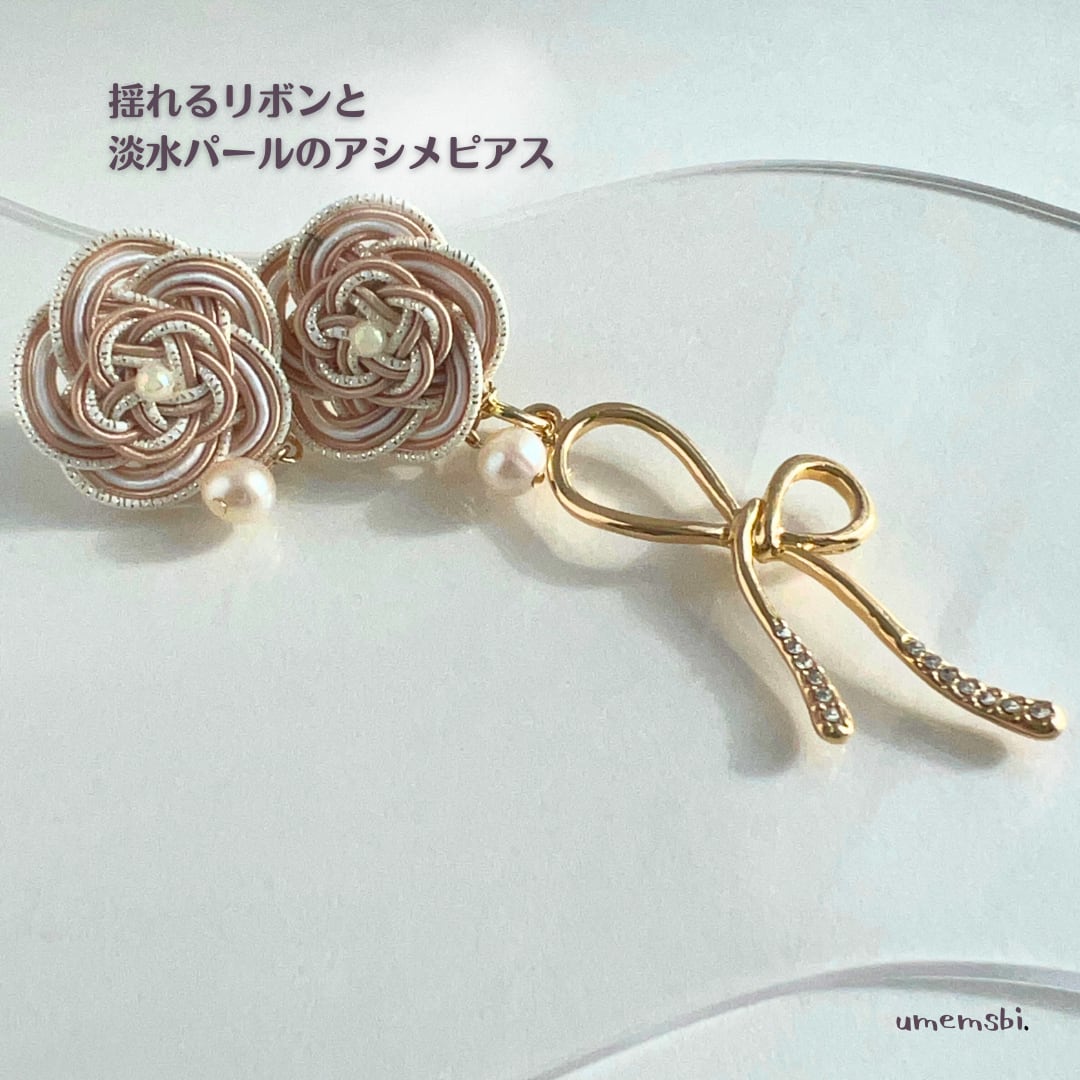 揺れるリボンと淡水パールのアシメ梅結びピアス