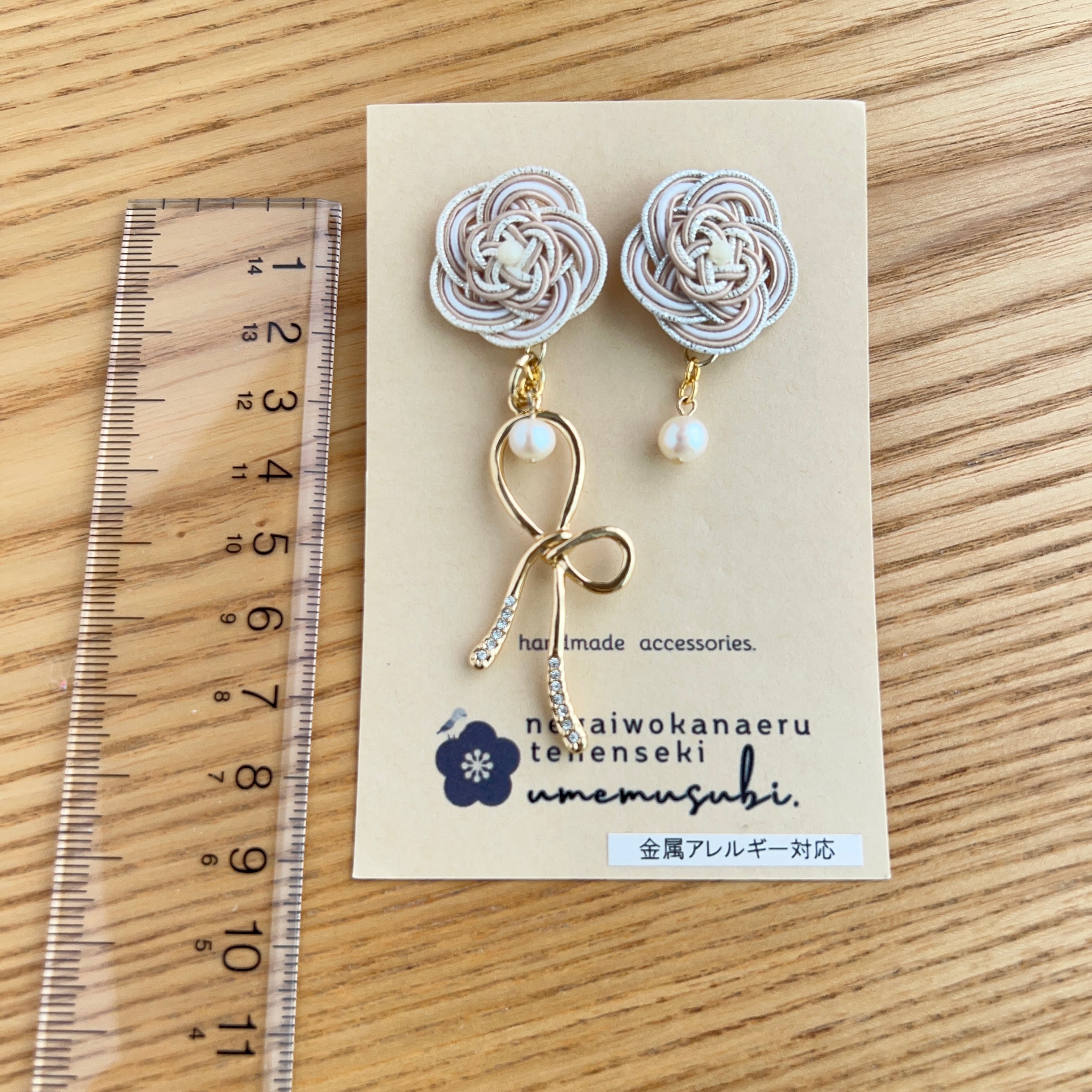 揺れるリボンと淡水パールのアシメ梅結びピアス 梅結びアクセサリー 天然石 ピアス イヤリング チャーム ストラップ 揺れるリボン 花火 夏祭り お守り ギフト 数量限定 日本色 上品 小ぶり