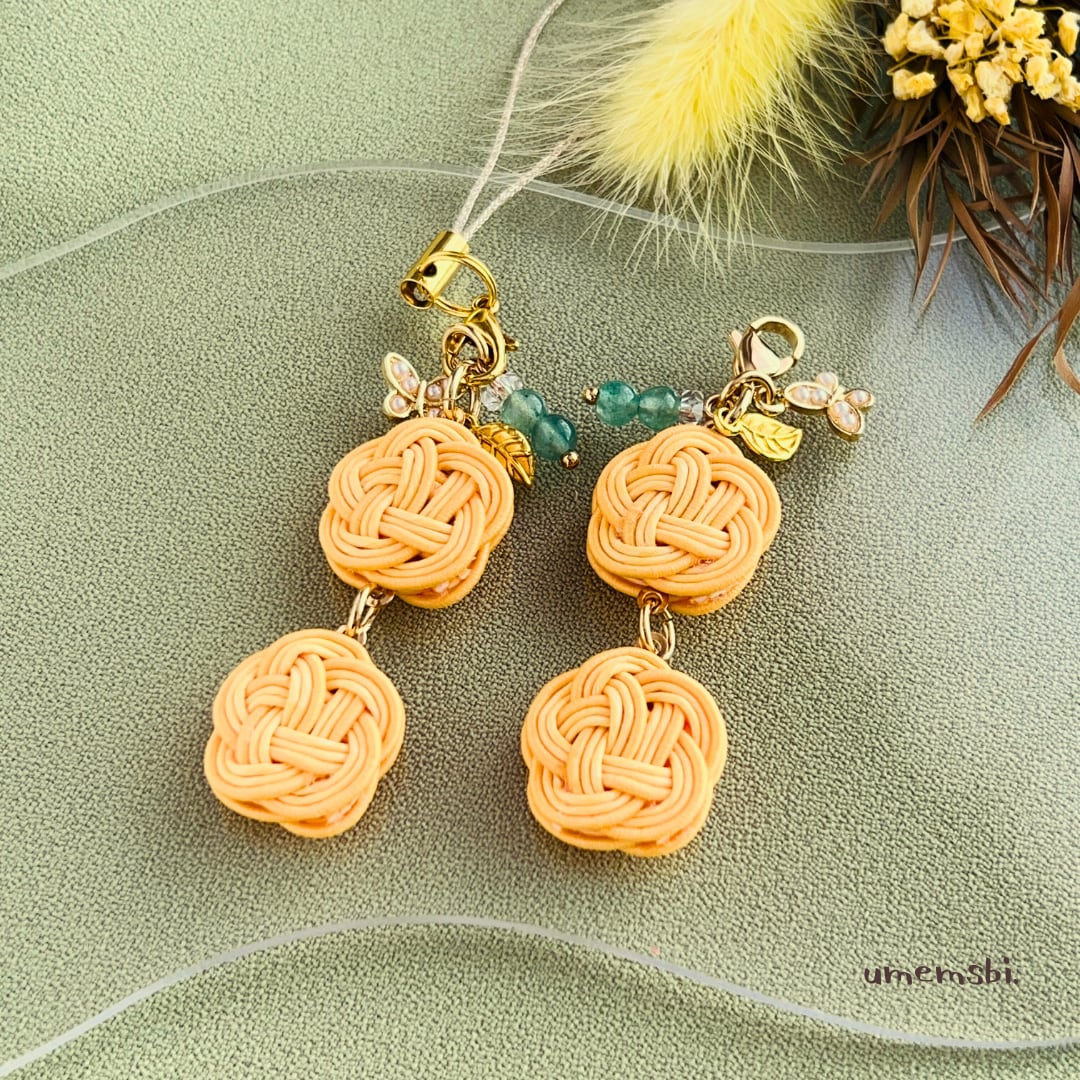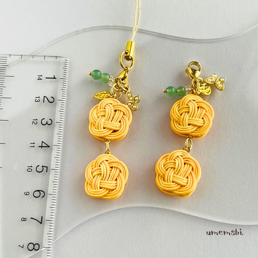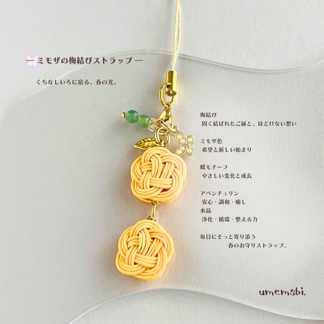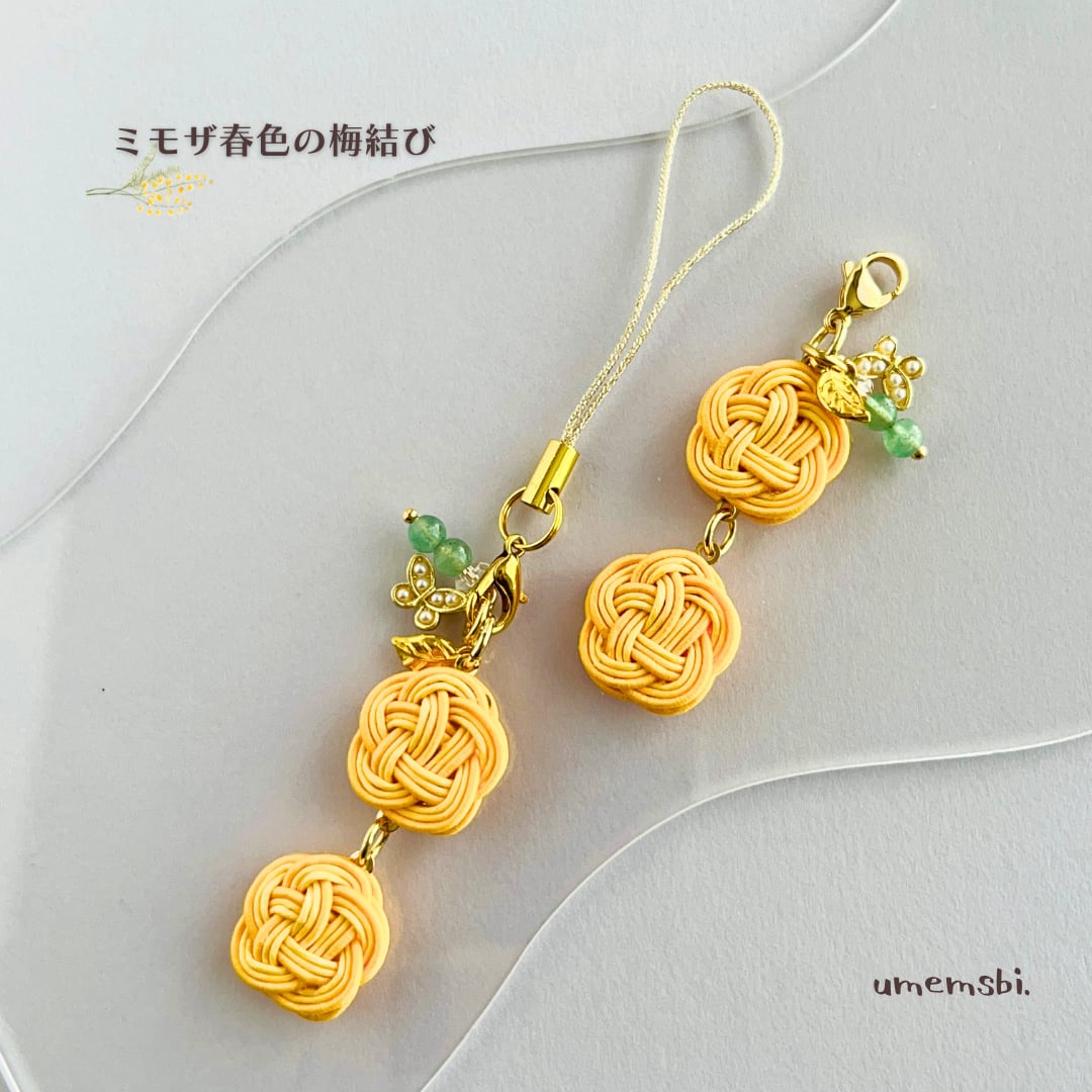 ミモザのやわらかな春色をイメージした梅結びチャームとストラップ。