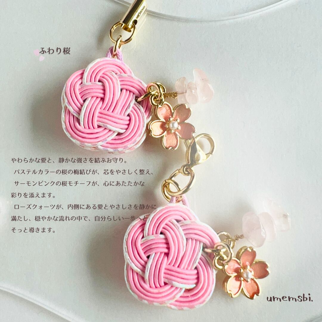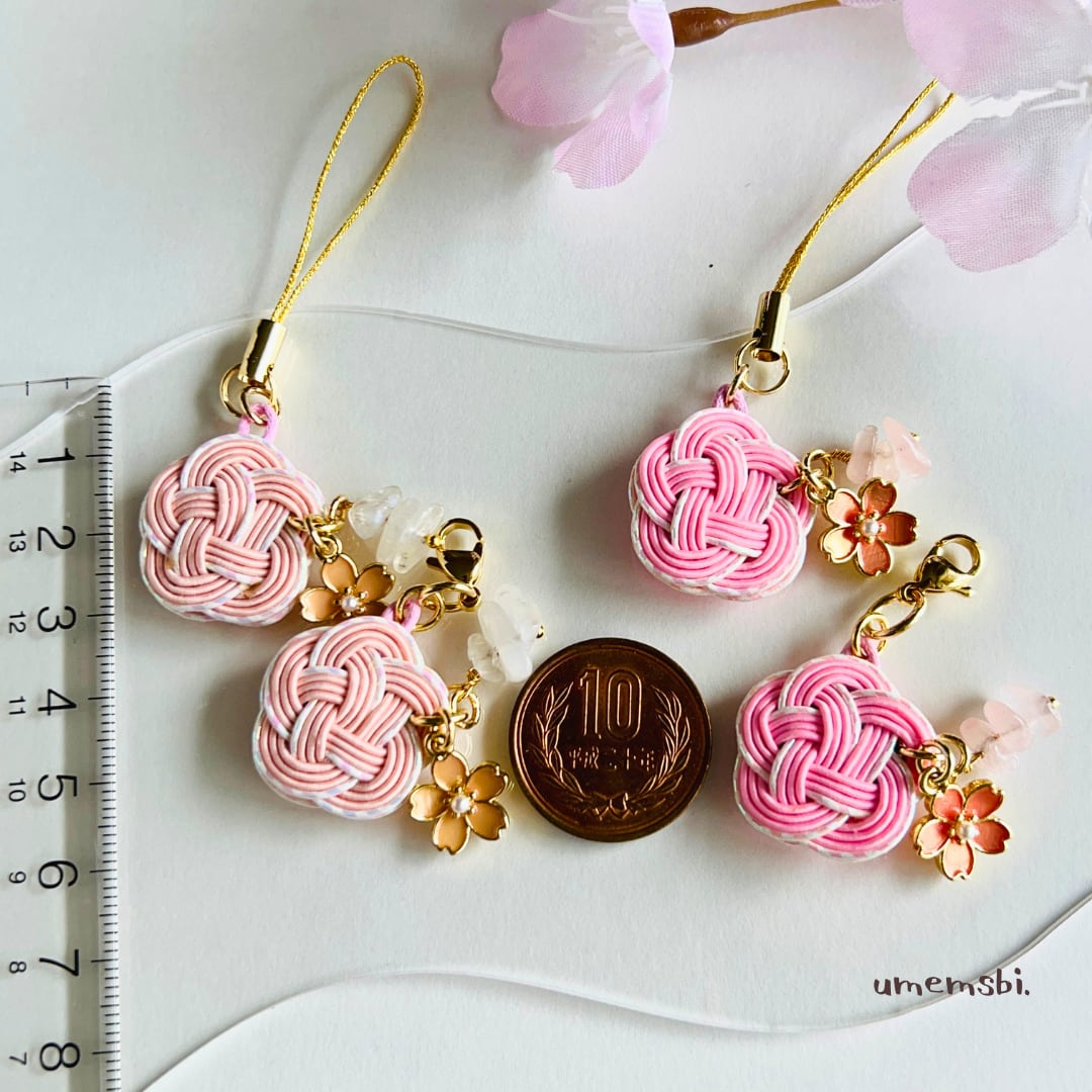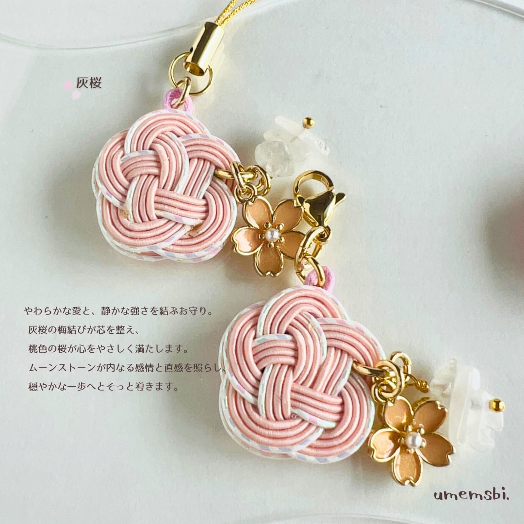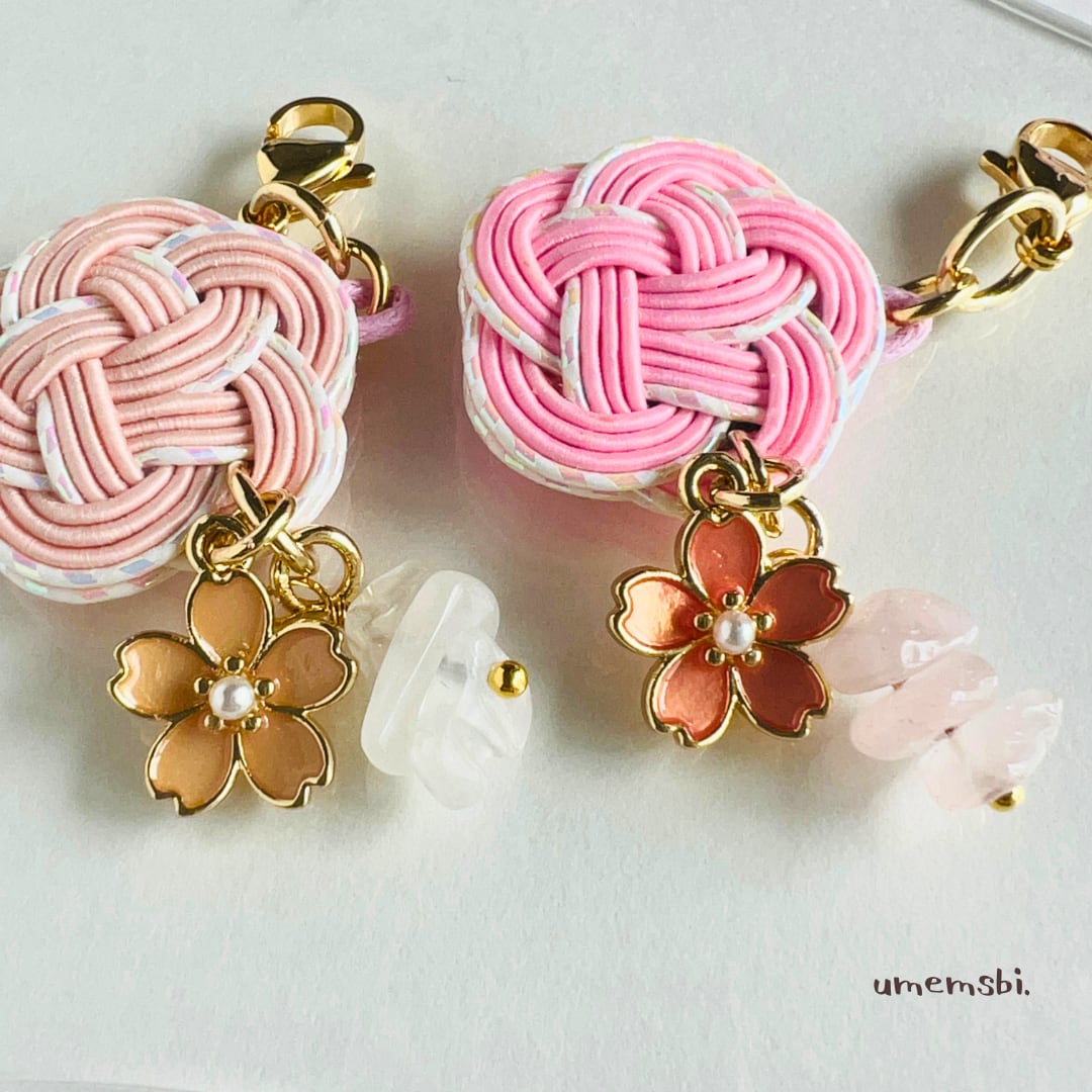 やわらかな桜の彩りをイメージした、梅結びチャームとストラップ。
