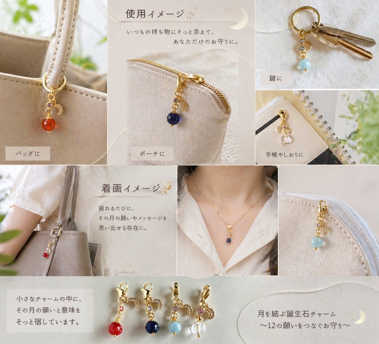 小さなチャームの中に、その月の願いと意味をそっと宿しています。